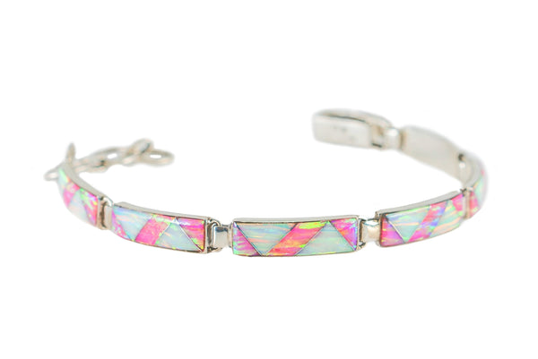 Each section of this Sterling Silver bracelet is inlaid with 5 pink opal and white fire opal stones.