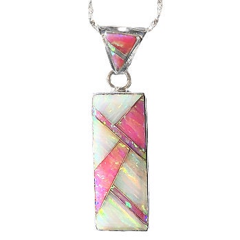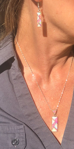 The art of inlay demonstrated beautifully in these earrings inlaid with Pink Opal and White Fire Opal. Each Sterling Silver casing is hand made one at a time and never casted. Then, the opal stones are cut with the grain in a process called "fire cutting" and inlaid one at a time. This technique gives each piece intense fire in a way that can only be found at OpalReefJewelry
